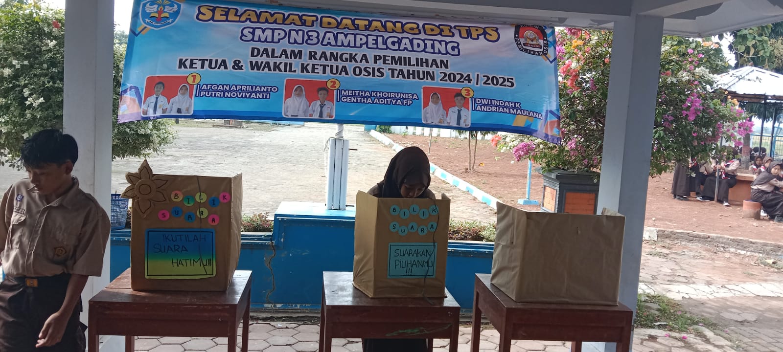 Ampelgading, Sabtu (30/11/2028) – Setelah melalui rangkaian pemilihan yang berlangsung demokratis dan penuh antusiasme, pasangan calon (paslon) nomor urut 3, Dwi Indah K dan Andrian Maulana, akhirnya dinyatakan sebagai Ketua dan Wakil Ketua OSIS SMP Negeri 3 Ampelgading periode 2024/2025. Pasangan ini unggul dengan perolehan suara terbanyak yang menunjukkan mendapatkan kepercayaan besar dari siswa terhadap visi dan misi mereka.